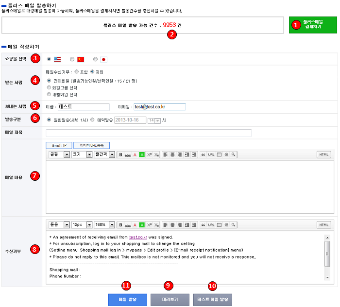 - 운영자 메일로 테스트 메일을 발송하여 정상유무 확인 후 실제 메일발송을 해주시는 것이 좋습니다.