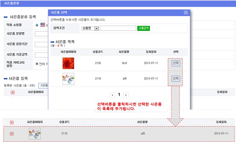 [사은품 분류 등록 > 사은품 선택 화면]