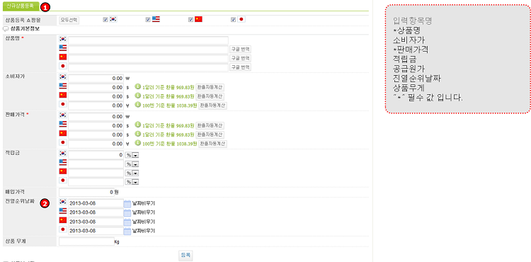 - 상품을 등록할 쇼핑몰 언어에 체크하시면 하단 상품정보 입력항목이 언어별로 입력할 수 있도록 표시됩니다.