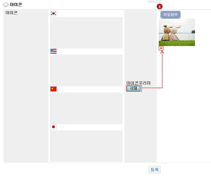 - 첨부파일에서 아이콘 등록 -> 언어별 공간(국기 밑 회색공간)에 드래그하여 넣기 -> 등록