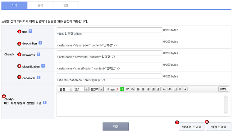 · SEO 상세설정 서비스 이용 경우 : 기본설정과 상세설정은 서로 독립적으로 저장되며, 둘 다 설정하신 경우 상세설정 값이 적용됩니다.