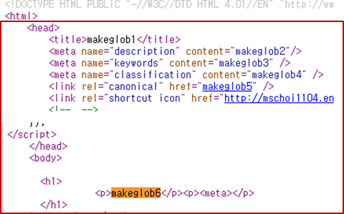 · SEO설정 시 전체 페이지의 html 소스 와 시작 부분에 각각 자동 삽입됩니다.