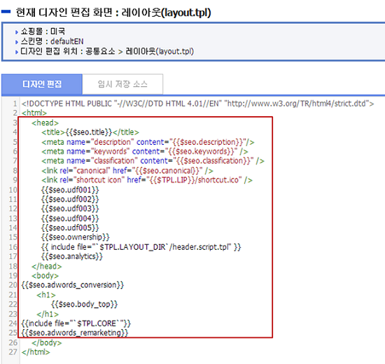 · [디자인스킨 관리]에서는 레이아웃(layout.tpl) 템플릿 편집 화면에서 SEO 예약어로 대체되어 표시됩니다.