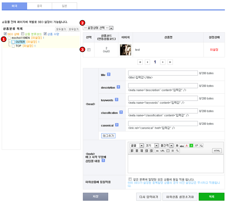 - ③ 하위분류에 동일적용 : - 하위분류에 SEO설정을 동일 적용할 수 있습니다.