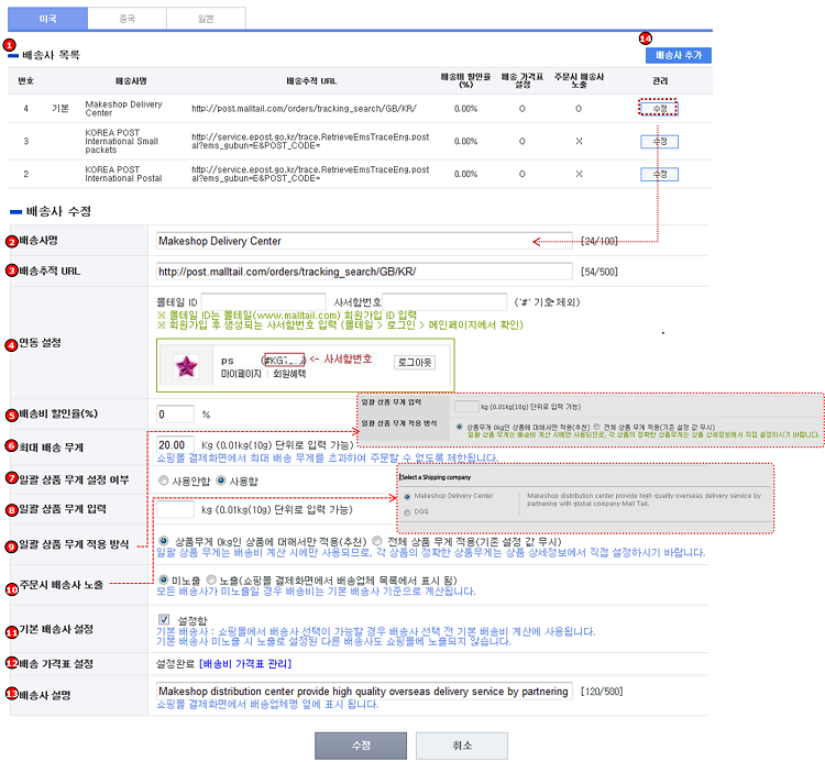 -위 사진과 같이 배송업체 명 옆에 표시 되는 내용을 입력합니다.