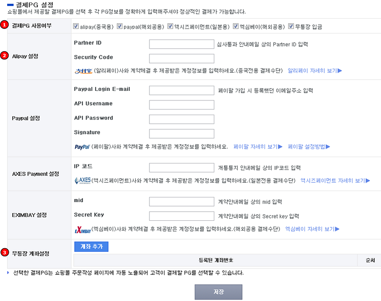 - 결제를 위한 PG사 접속계정정보를 설정합니다.(상점에서 PG사 계약완료 후 PG사로부터 계정정보를 받아 설정)
